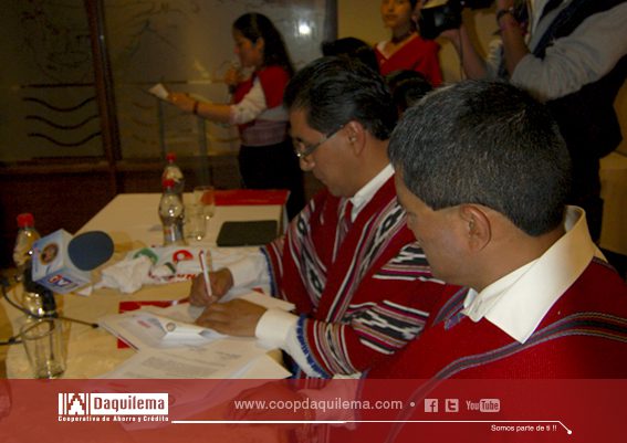 En el salón Cascada del Hotel Zeus en la ciudad de Riobamba el miércoles 18 de febrero de 2015 se realizó la suscripción de la carta de intención entre la Cooperativa de Ahorro y Crédito Mushuc Runa Ltda. y la Cooperativa de Ahorro y Crédito Fernando Daquilema Ltda. Previa a la firma se dio una rueda de medios en la que se atisbó los alcances de convenio marco a suscribirse en el futuro entre las dos entidades. A esta conferencia asistieron por la Cooperativa Mushuc Runa el Abogado Luis Alfonso Chango Gerente, Ing. César Pandi, Jefe de Agencia Riobamba y Lorenzo Pichasaca, presidente Mushuc Runa Sporting Club, y por la Cooperativa Daquilema el Ing. Pedro Khipo, Gerente, Pastor Pablo Guachilema, Presidente e Ing. Marcelo Guamán Jefe de Negocios.